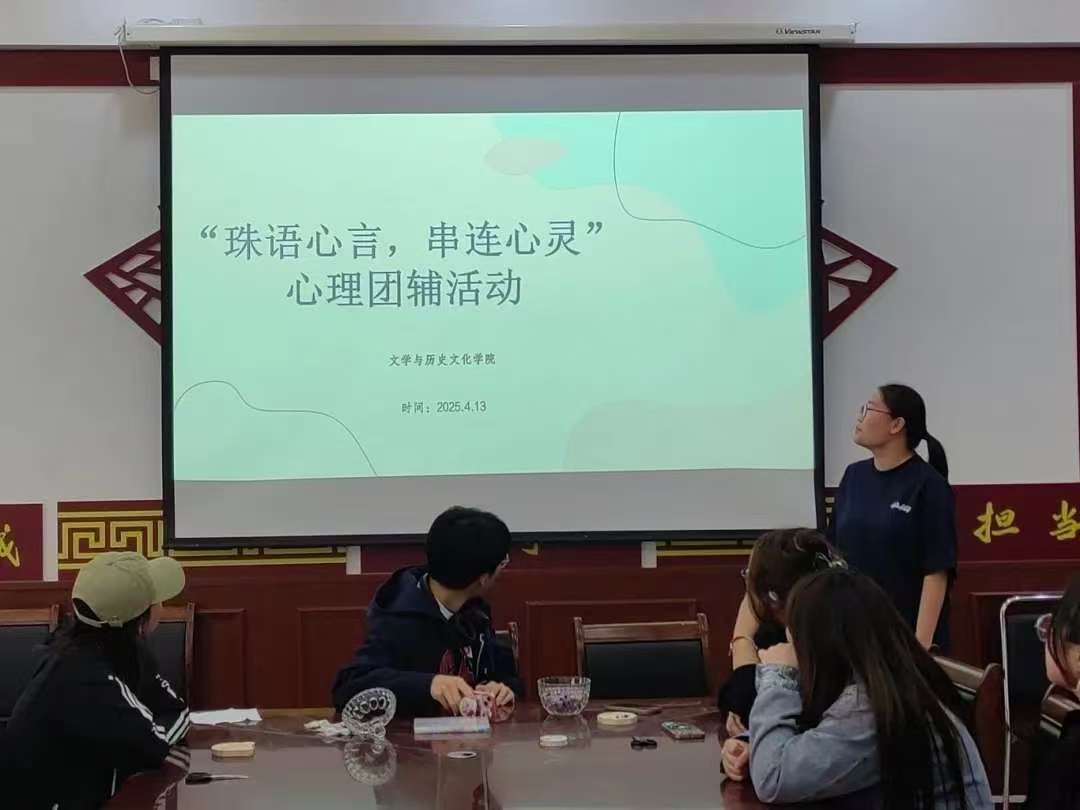 为同学们提供一个放松身心、释放压力的平台,同时培养同学们的动手能力和团队合作意识,4月13日,文学与历史文化学院组织开展“珠语心言,串连心灵”心理团辅活动。