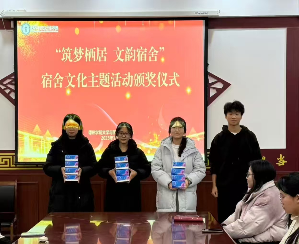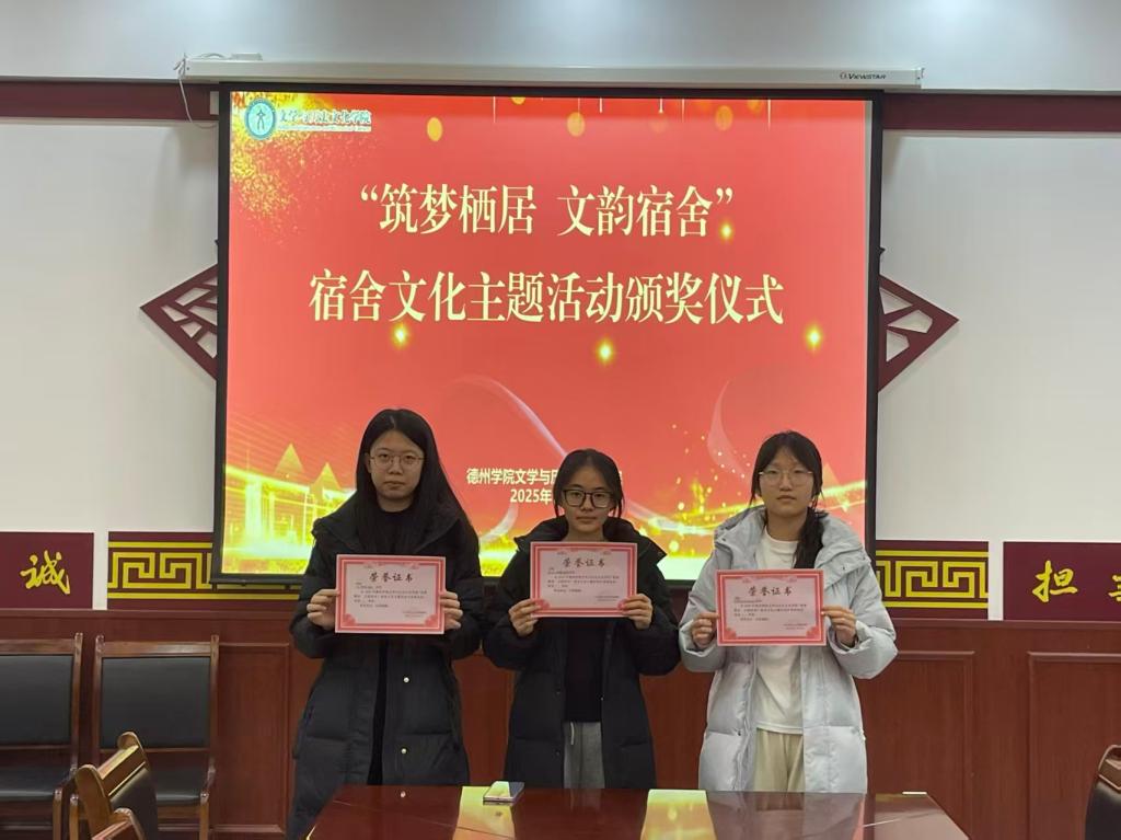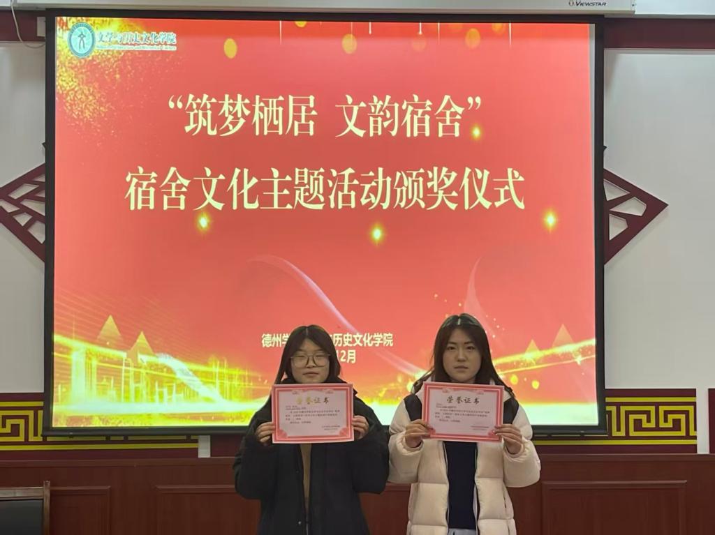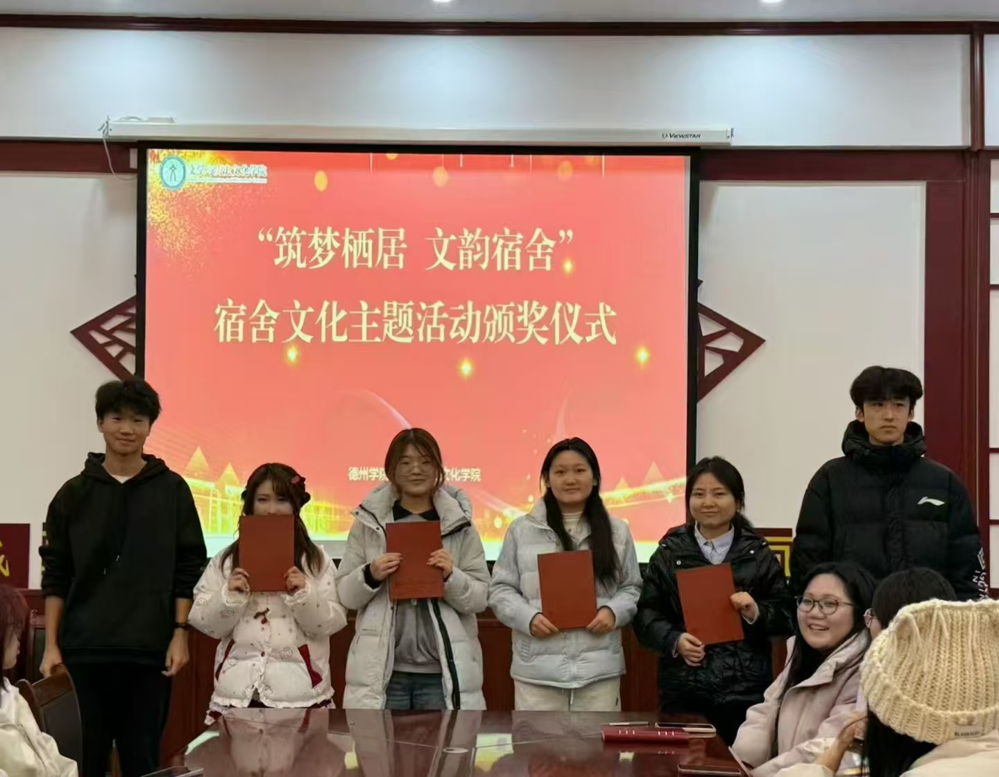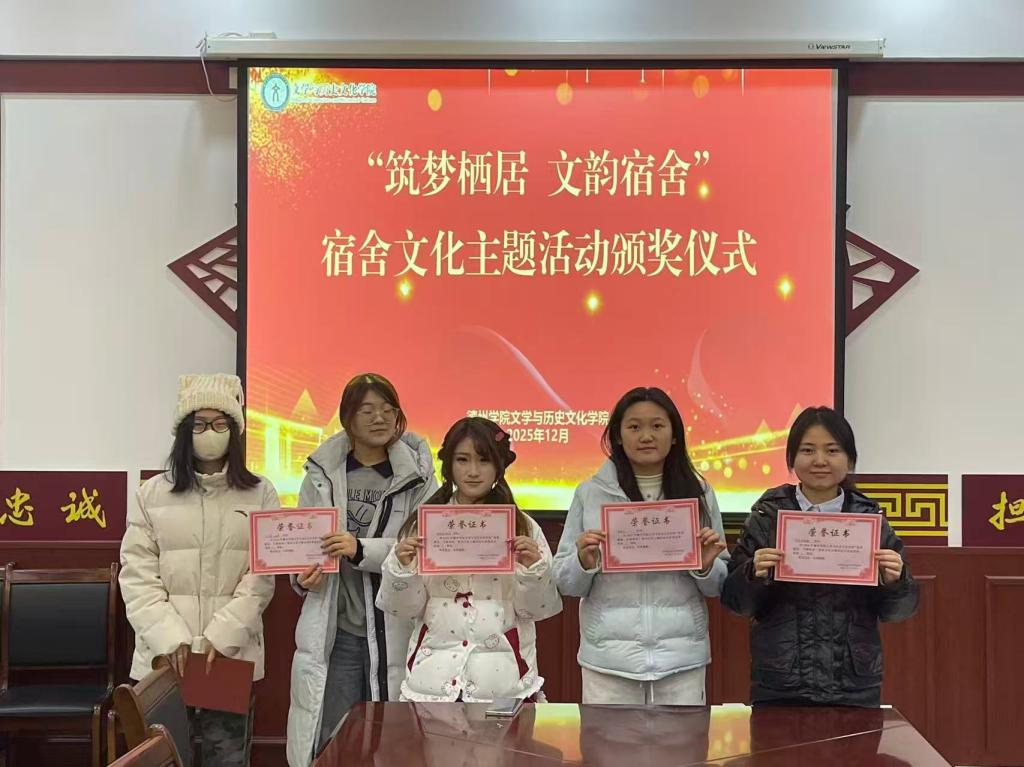 为表彰在“筑梦栖居,文韵宿舍”活动中表现优异的集体与个人,并总结成果、弘扬宿舍文化精神,12月16日,德州学院文学与历史文化学院举办“筑梦栖居,文韵宿舍”活动颁奖典礼。文学与历史文化学院党委副书记鞠晶晶、辅导员沙彦君及获奖同学代表参与了本次典礼。