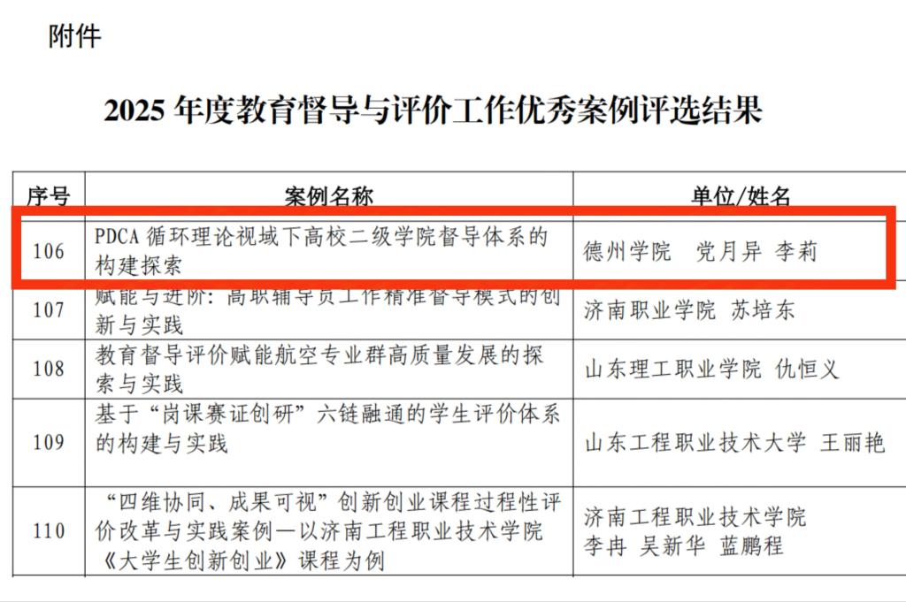 近日,山东省教育督导学会发布《关于公布2025年度教育督导与评价工作优秀案例评选结果的通知》(鲁教督会字〔2026〕2号),经资格审查、专家评审和评委会会审,我党月异与李莉2位老师共同完成的《PDCA循环理论视域下高校二级学院督导体系的构建探索》案例成功入选优秀案例,彰显了我院在教育教学督导体系建设与改革创新方面的扎实成效。