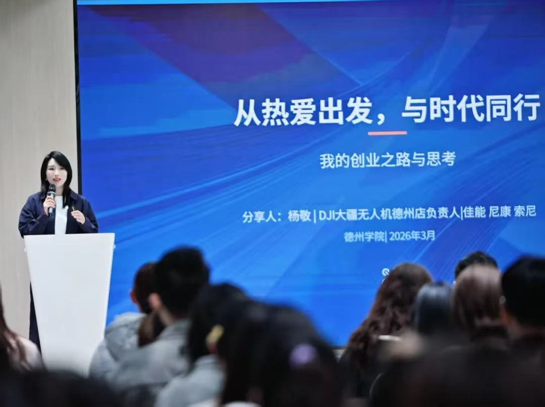 杨敬以《从热爱出发,与时代同行》为题,分享了她从热爱影像到引入大疆无人机、构建多元影像生态的创业历程。她鼓励同学们将个人兴趣与国家大势相结合,在数字经济浪潮中找准方向、持续深耕。