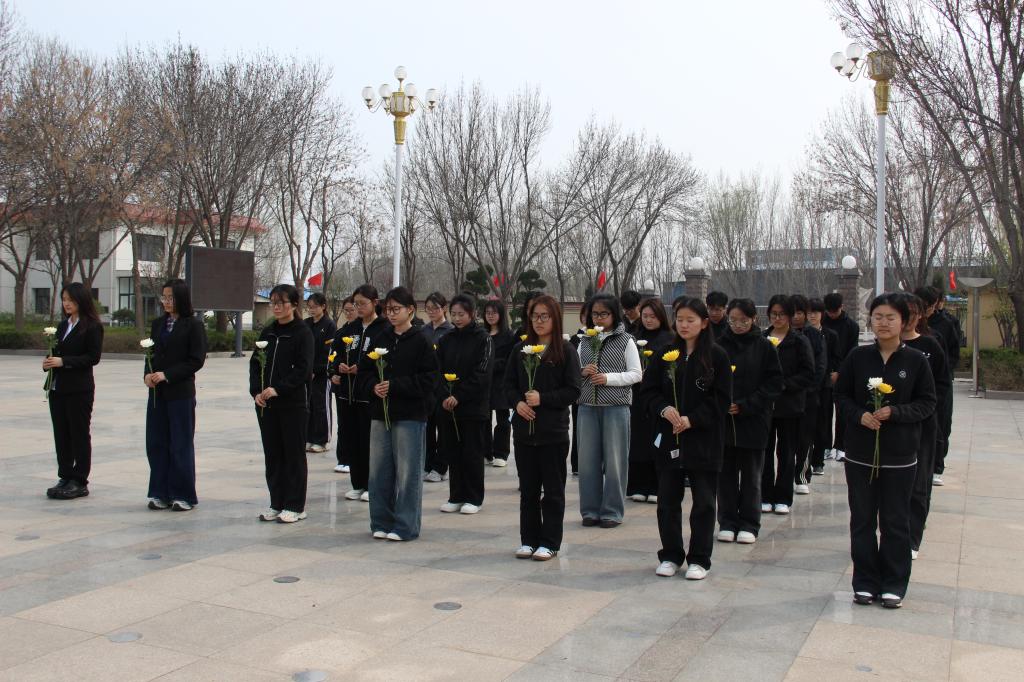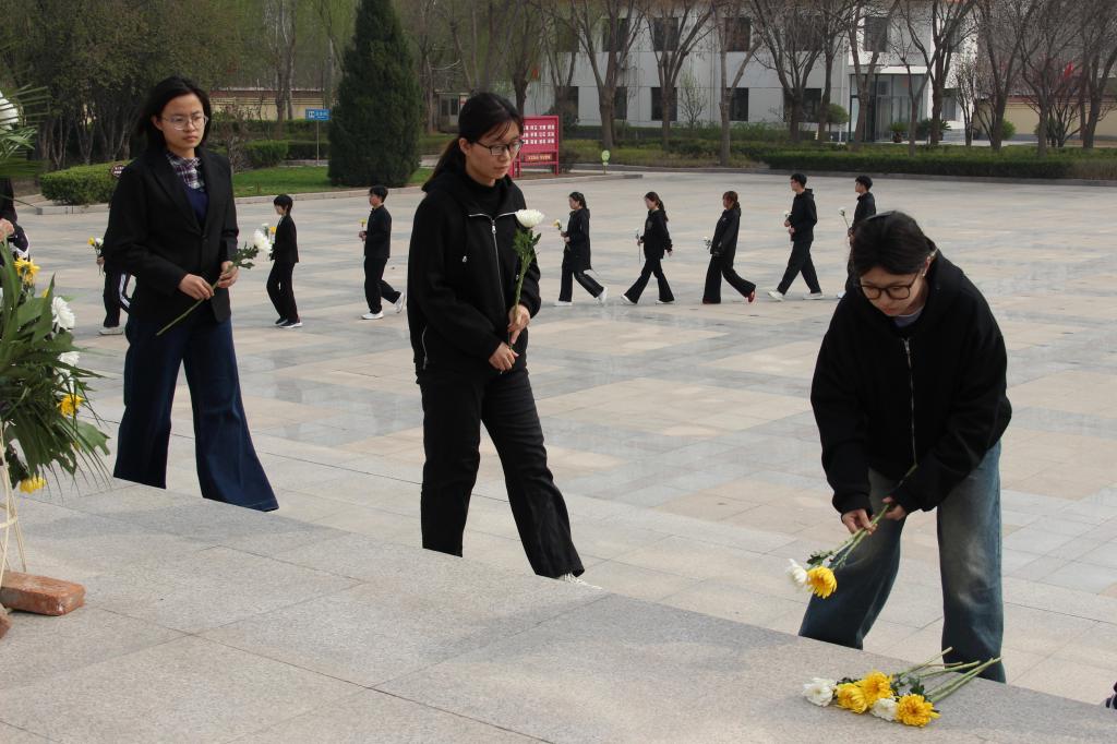 活动现场庄严肃穆,全体学生身着黑衣,神情庄重,肃立于人民英雄纪念碑前,向革命先烈默哀三分钟。默哀结束后,学生代表发言,深情回顾先烈为民族解放不懈奋斗的峥嵘岁月,号召同学们铭记历史、勇担使命,将个人理想融入国家发展大局。随后,同学们手捧白菊花,依次向革命先烈敬献鲜花、行鞠躬礼,表达深切缅怀与崇高敬意。