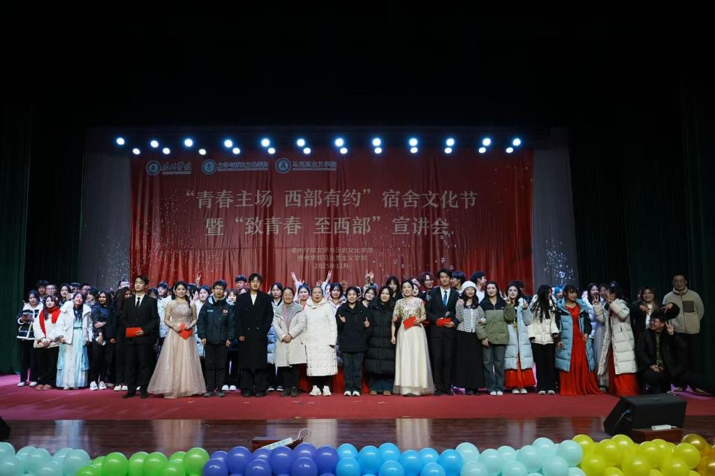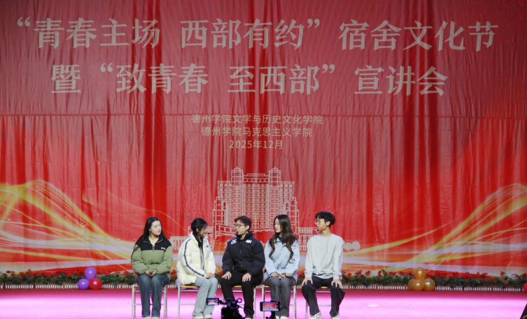 为丰富校园文化生活,深化青年学子对西部计划的认知,德州学院文学与历史文化学院、马克思主义学院共同举办“青春主场 西部有约”宿舍文化节暨“致青春 至西部”宣讲会。文学与历史文化学院党委副书记鞠晶晶、学生办公室主任刘娟、马克思主义学院辅导员张亚男老师、文学院团委书记张亮、辅导员沙彦君、25级新闻二班班主任冯旭珉老师及张龙老师出席活动,两学院学生积极参与。