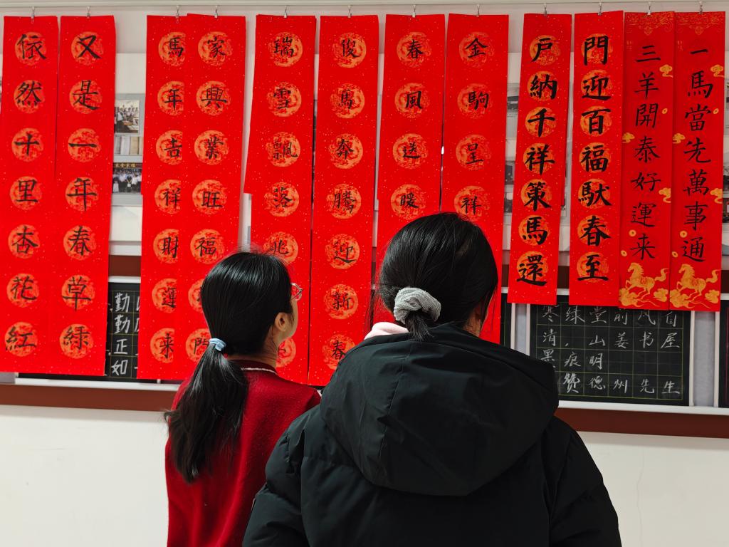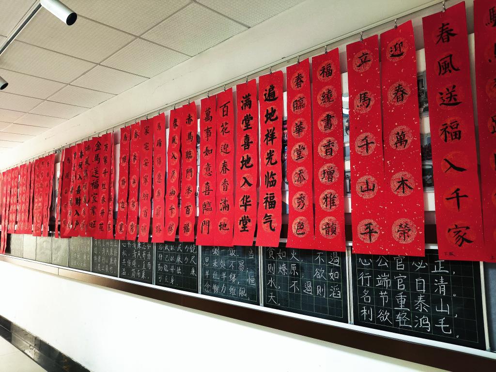 同学们铺纸挥毫、落笔成联,将书法技艺与文学才思融入春联创作之中。春联长廊内,红底墨字的作品错落棋布,墨香与红纸的暖意交织弥漫。“春风入户纳千祥,赤马临门添百福”笔势沉稳,藏着阖家纳祥的美好心愿;“百花迎春香满地,万事如意喜临门”对仗精巧,满含新春顺遂的真挚期盼。楹联的文学雅致与书法的艺术张力相得益彰,将中华传统文化的独特魅力展现得淋漓尽致。往来师生驻足其间,目光在一幅幅作品上流连,大家在红联墨韵的环绕里,沉浸式感受着传统文化的魅力,心底那份对传统的热爱与认同,也愈发浓烈真切。